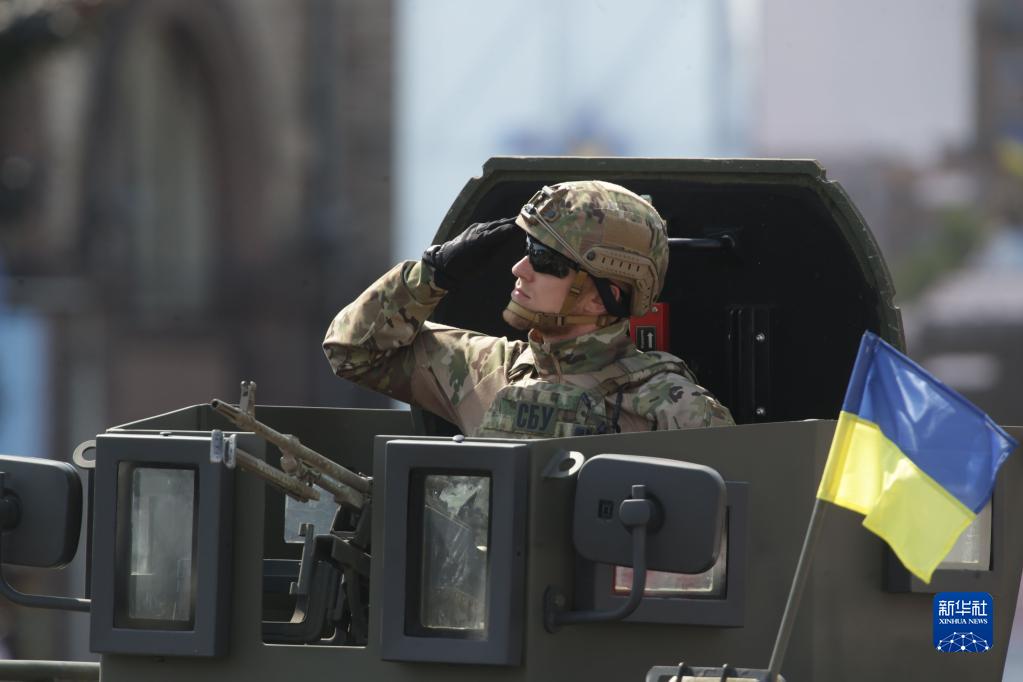 8月24日,在乌克兰首都基辅,一名士兵参加阅兵式。当日,乌克兰在首都基辅举行阅兵,庆祝独立30周年。新华社发(谢尔盖·斯塔拉斯坚科 摄)