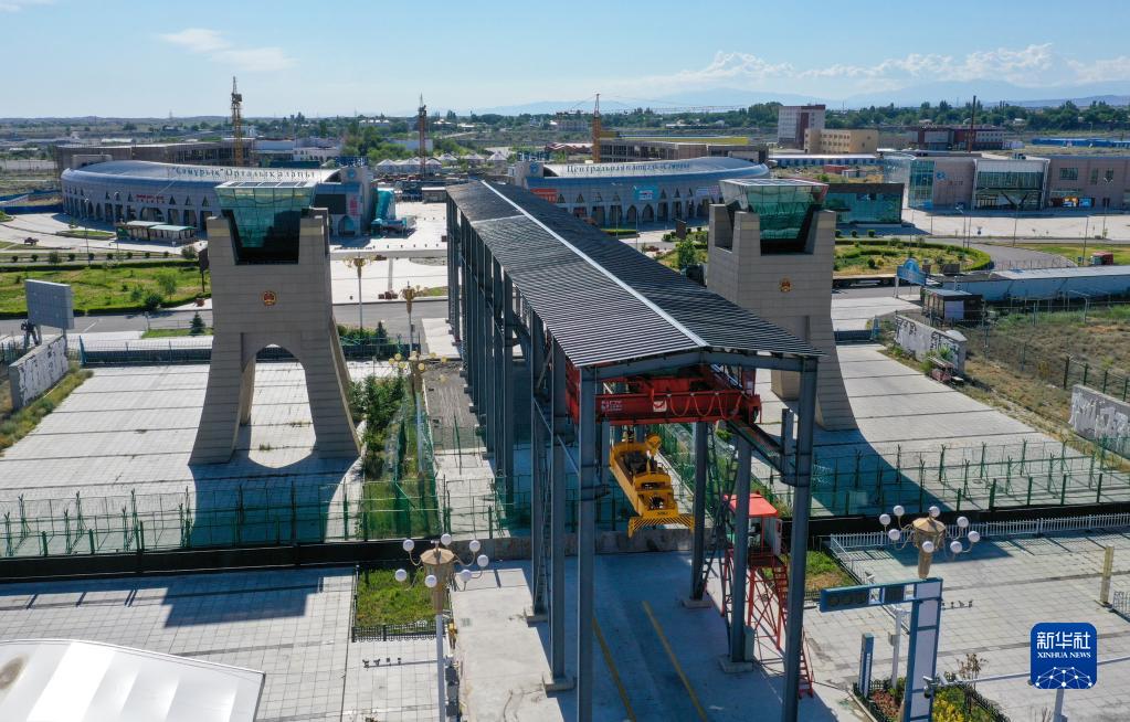 这是6月15日在新疆中哈霍尔果斯国际边境合作中心拍摄的“空中陆桥”(无人机照片)。新华社记者 丁磊 摄