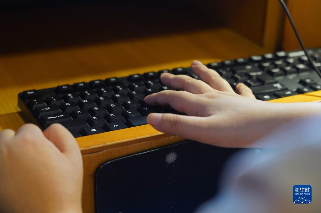 王磊用能动的一根手指敲击键盘,回复病友的问题(8月23日摄)。新华社记者 万象 摄