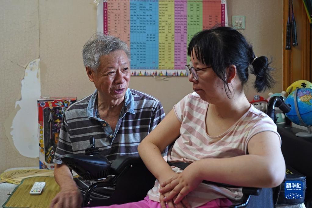 王磊(右)和父亲王伦甫在家中交谈(8月23日摄)。新华社记者 万象 摄