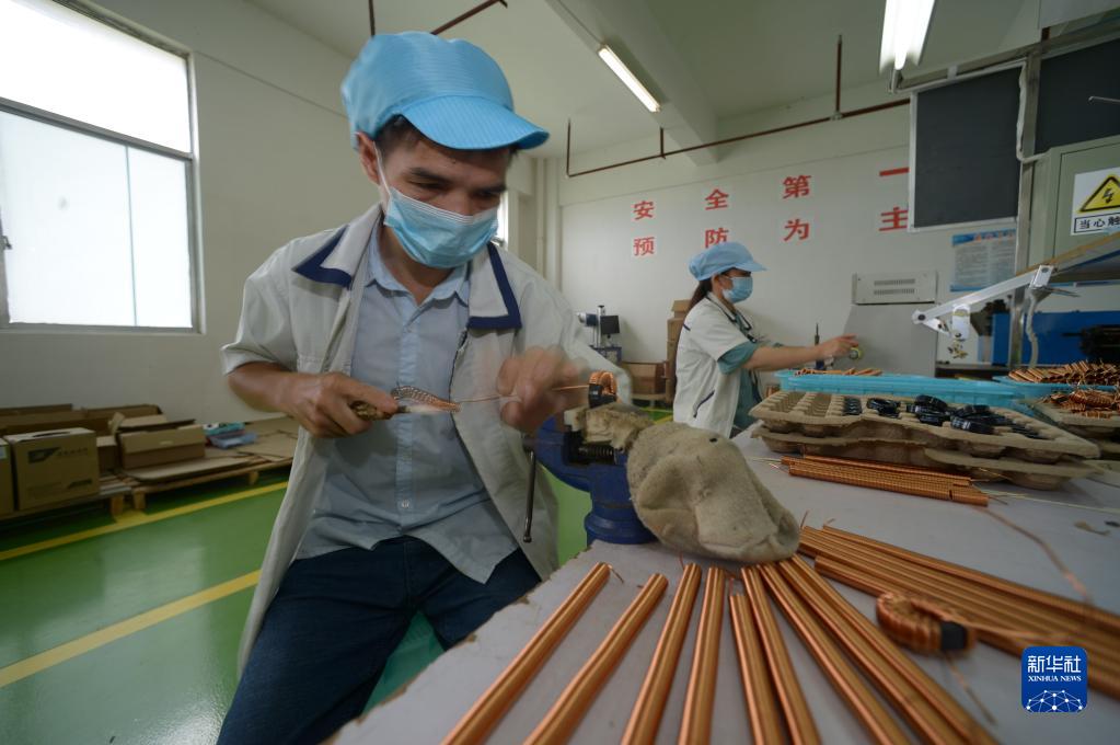 8月26日,工人在贵州省黔东南苗族侗族自治州丹寨金钟经济开发区一家电子原器件生产企业加工微型变压器零部件。