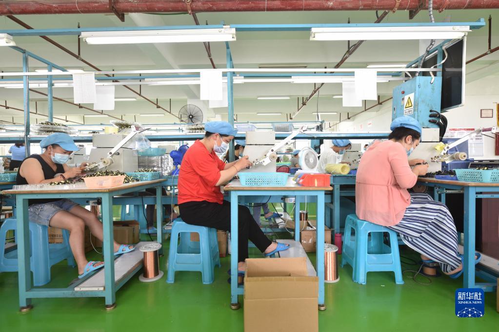 8月26日,工人在贵州省黔东南苗族侗族自治州丹寨金钟经济开发区一家电子原器件生产企业加工微型变压器零部件。