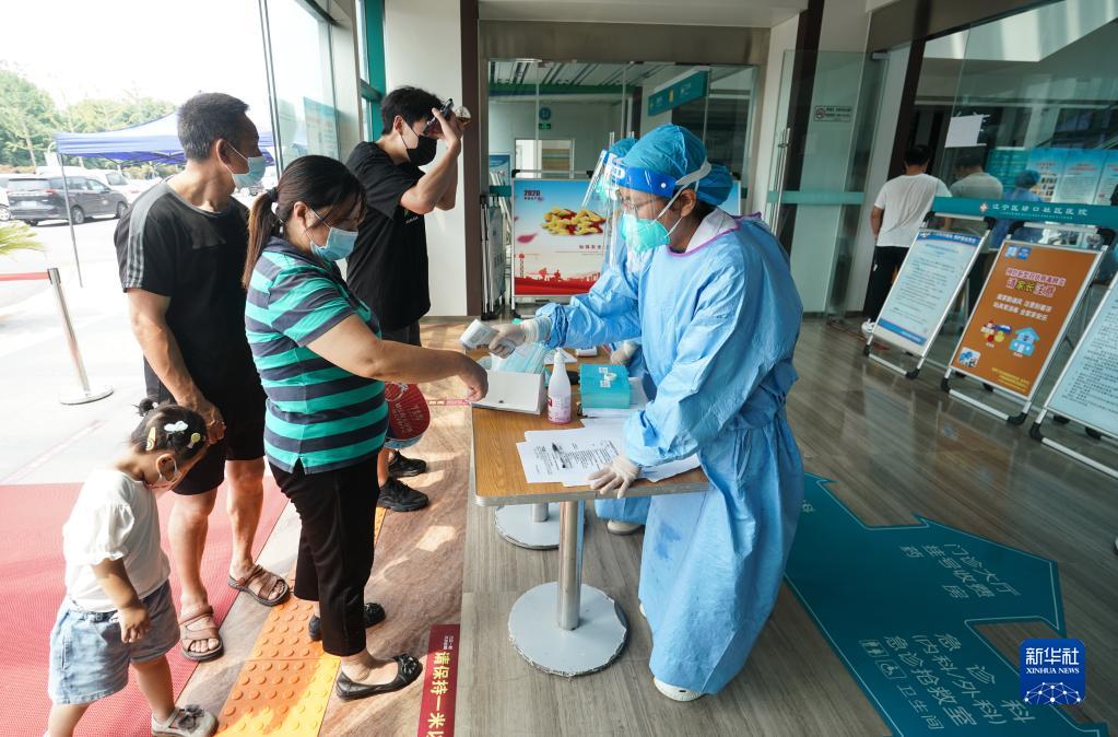 8月26日,在江宁区禄口社区医院入口,居民在接受体温测量。