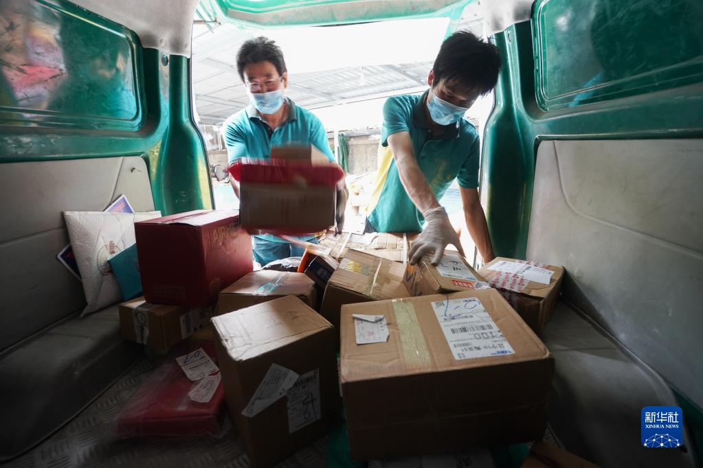 8月26日,在江宁区禄口街道一处邮政快递投递部,工作人员在装运快递。