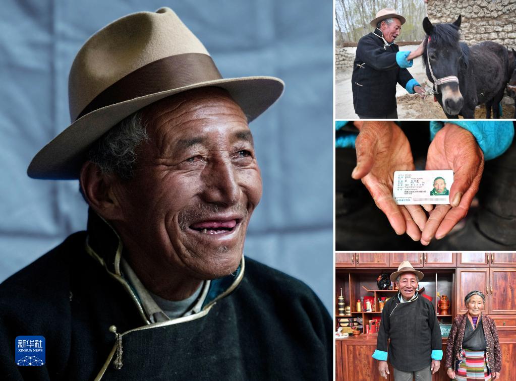 拼版照片。左:多布杰老人的肖像;右上:多布杰老人在照顾家里的马匹;右中:多布杰老人的身份证;右下:多布杰老人(左)和老伴普布潘多在班久伦布村的家里(5月10日摄)。