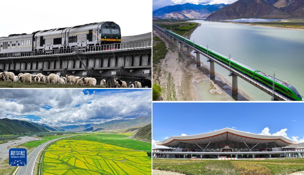 拼版照片。左上:2019年6月10日拍摄的青藏铁路上行驶的列车(新华社记者觉果摄);右上:2021年6月16日,试运行的复兴号列车从雅鲁藏布江边驶过(新华社记者普布扎西摄,无人机照片);左下:2019年7月16日拍摄的拉林公路沿线油菜花和青稞地(新华社记者张汝锋摄,无人机照片);右下:2021年6月30日拍摄的拉萨贡嘎国际机场T3航站楼外景(新华社记者晋美多吉摄)。
