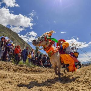 当日,位于雅鲁藏布江畔山谷里的西藏山南市贡嘎县昌果乡岗旦村举行一年一度的赛马,迎接即将到来的收获季节。