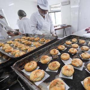 8月27日,在塘栖镇的老刀食品工厂里,工人们在放料和面,准备制作传统的白果月饼。