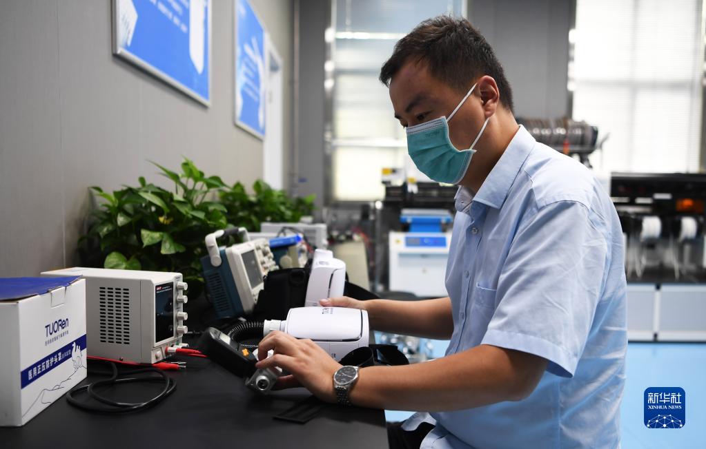 8月26日,在河南新乡长垣市,驼人集团结构工程师左勇魁在实验室中测试“空调防护服”送风系统的风量大小。新华社记者 张浩然 摄