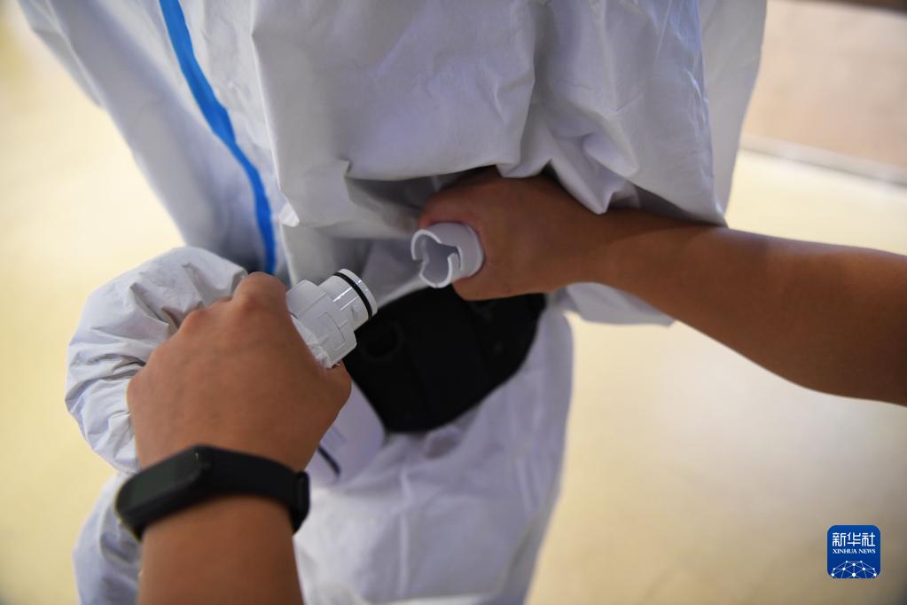 8月26日,在位于河南新乡长垣市的驼人集团,工作人员准备为“空调防护服”接入送风系统。新华社记者 张浩然 摄
