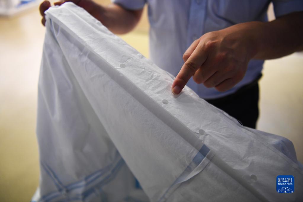 8月26日,在河南新乡长垣市,驼人集团防护解决方案部总监崔俊卿介绍“空调防护服”里的环绕式送风孔。新华社记者 张浩然 摄