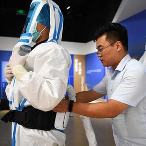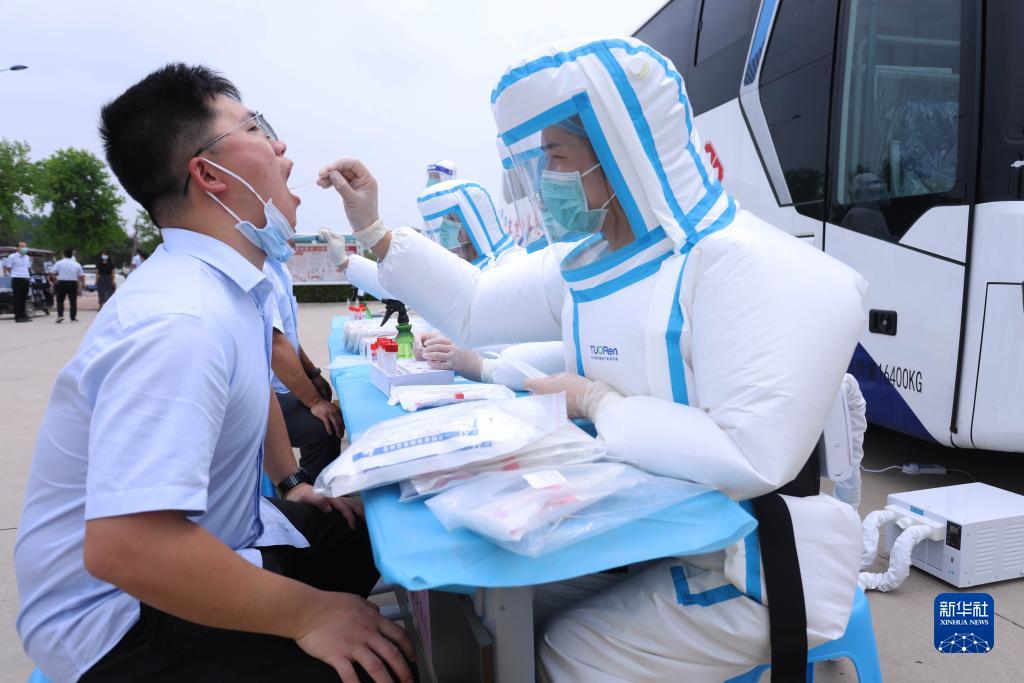 8月19日,在河南新乡长垣市妇幼保健院,医护人员身着“空调防护服”为群众做核酸检测取样。新华社发(闫松浩 摄)
