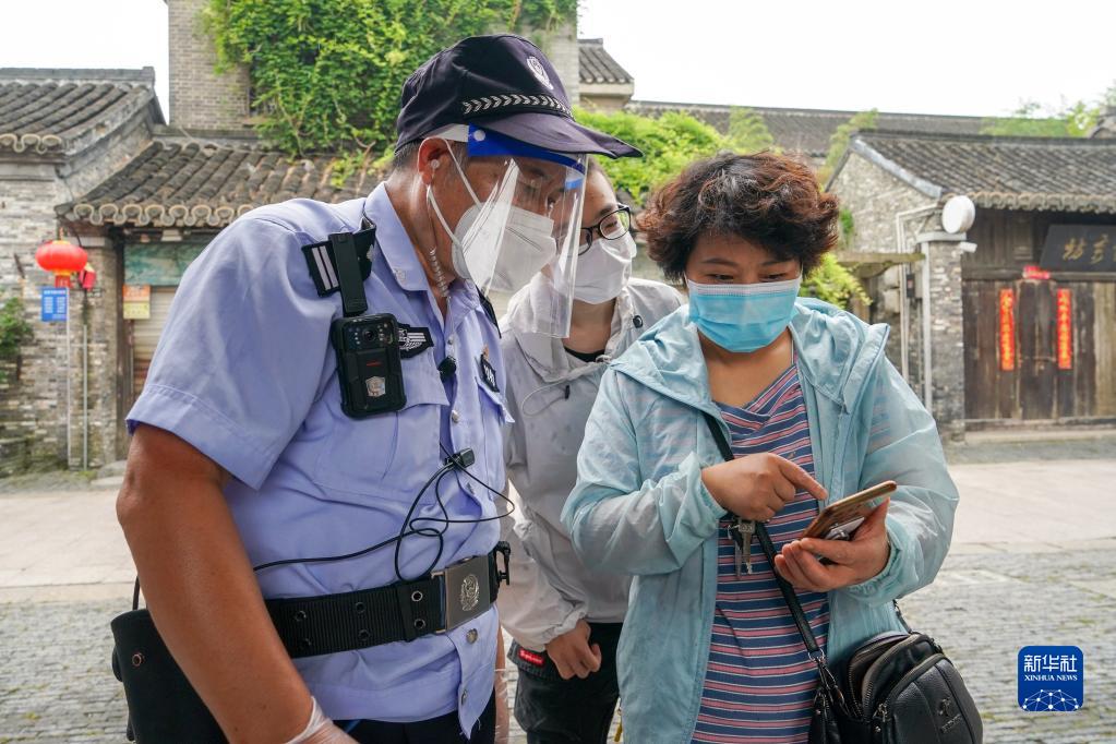 在扬州市广陵区东关街道个园社区核酸检测点,樊学锋(左)在查看居民健康码(8月20日摄)。“警察蓝”——樊学锋是扬州市公安局广陵分局东关派出所个园社区民警。疫情发生以来,作为基层社区民警,他和同事们坚守基层防疫一线,巡查、走访,维持核酸检测现场秩序,配合社区做好相关工作。