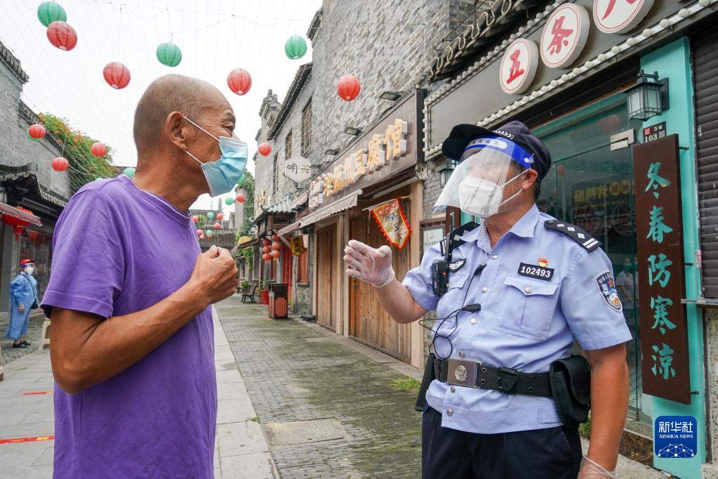 在扬州市广陵区东关街道个园社区核酸检测点,樊学锋(右)向社区居民宣传防疫知识(8月20日摄)。