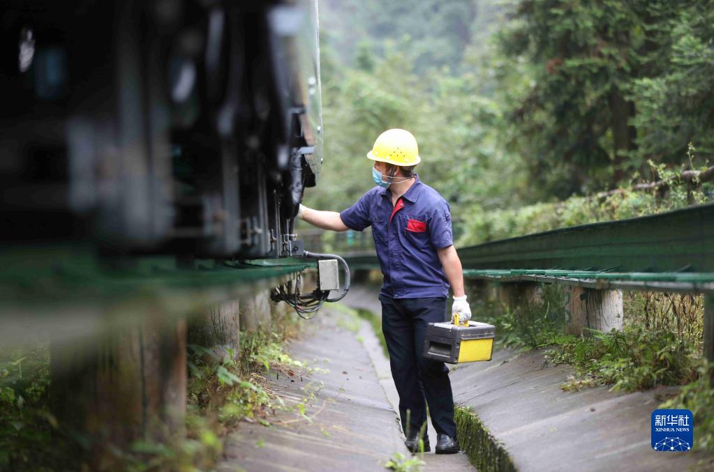 8月27日,湖南张家界武陵源景区工作人员对十里画廊观光电车的钢轨、电气设施等进行安全检查。