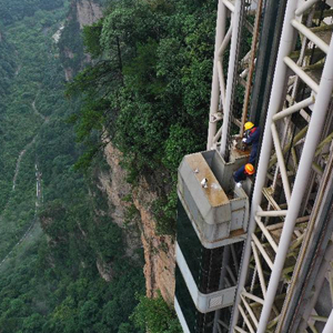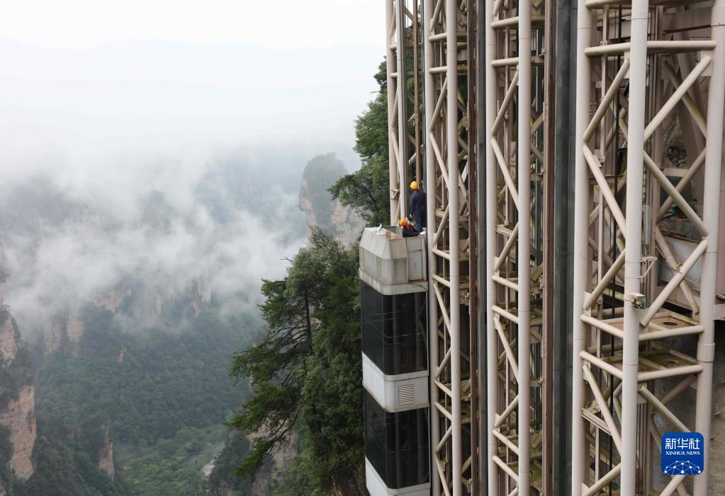 8月27日,湖南张家界武陵源景区工作人员在百龙天梯的悬崖钢井架上巡检。