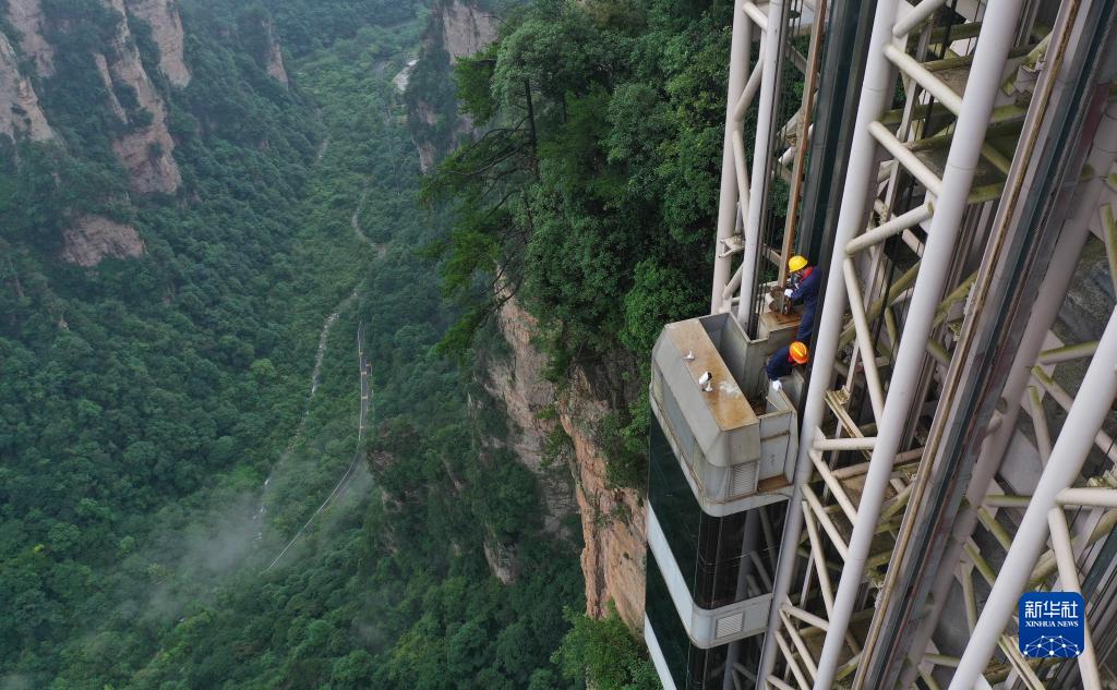 8月27日,湖南张家界武陵源景区工作人员在百龙天梯的悬崖钢井架上巡检(无人机照片)。