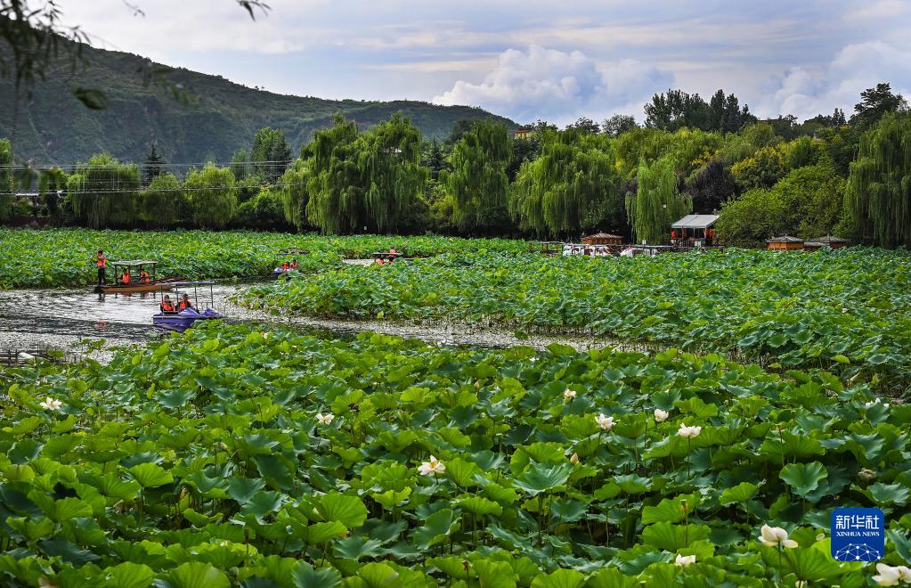 8月26日,游客在棣花古镇千亩荷塘游玩。