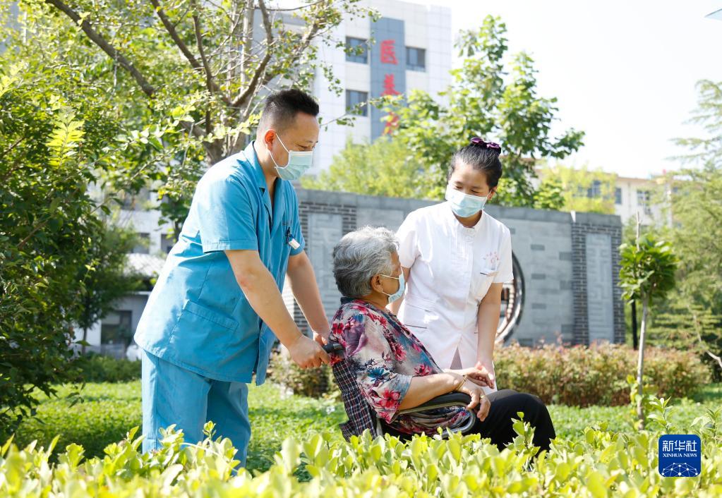 8月27日,邢台市南和区中医院医养中心医护人员陪老人散心。