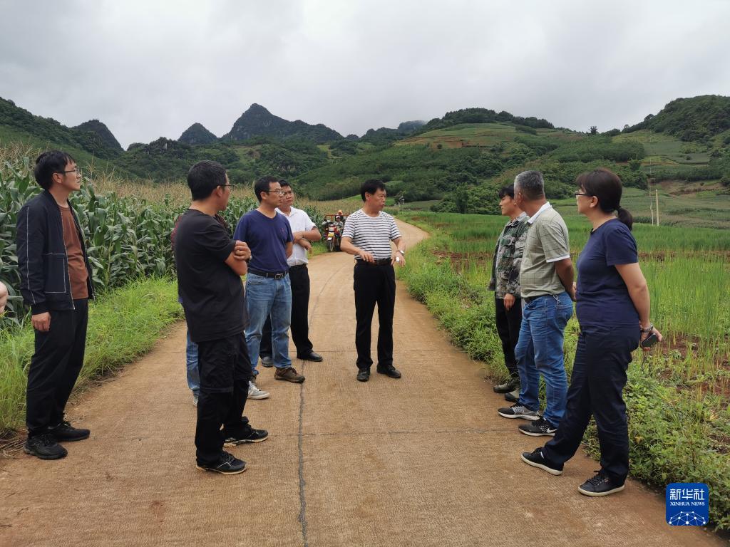 中国工程院院士朱有勇(右四)在云南省澜沧拉祜族自治县竹塘乡安排生产基地的发展规划(8月14日摄)。