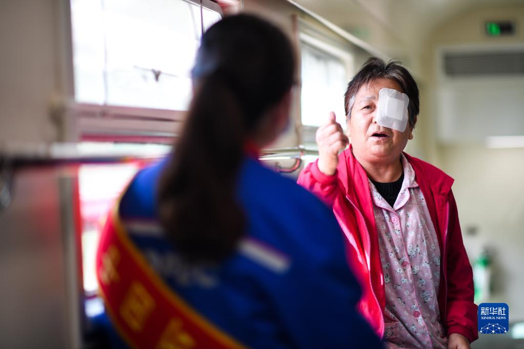 8月27日,在青海省海东市乐都区,“健康快车”上一名患者在手术后向志愿者竖起大拇指。