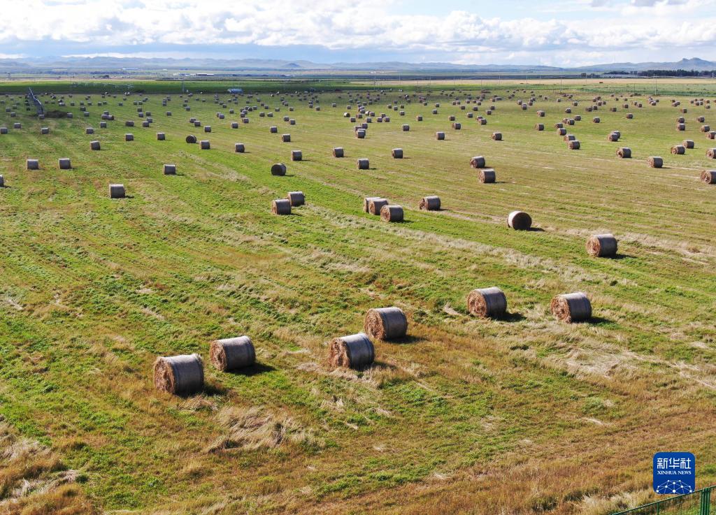 这是8月27日在张家口市塞北管理区黄土湾国家草原自然公园拍摄的牧草秋收场景(无人机照片)。