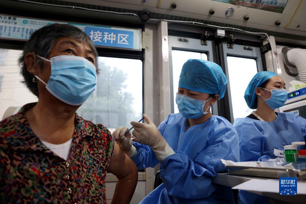 8月27日,在合肥市瑶海区大兴镇东岗社区裕和兴苑小区,医务人员在流动疫苗接种服务车上为居民接种新冠疫苗。