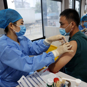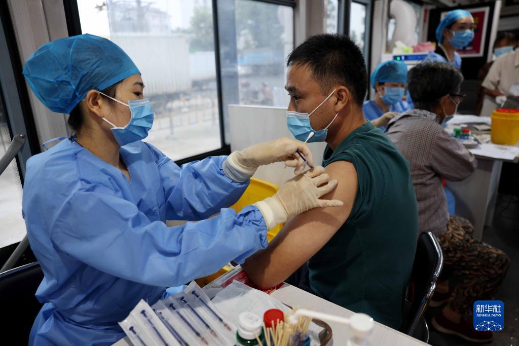 8月27日,在合肥市瑶海区大兴镇东岗社区裕和兴苑小区,医务人员在流动疫苗接种服务车上为居民接种新冠疫苗。
