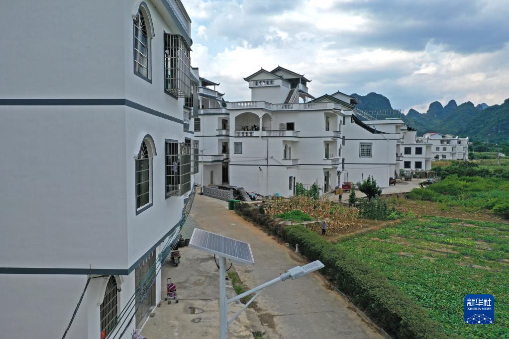 这是广西桂林市平乐县张家镇老鸦村安装的太阳能路灯(无人机照片,7月14日摄)。