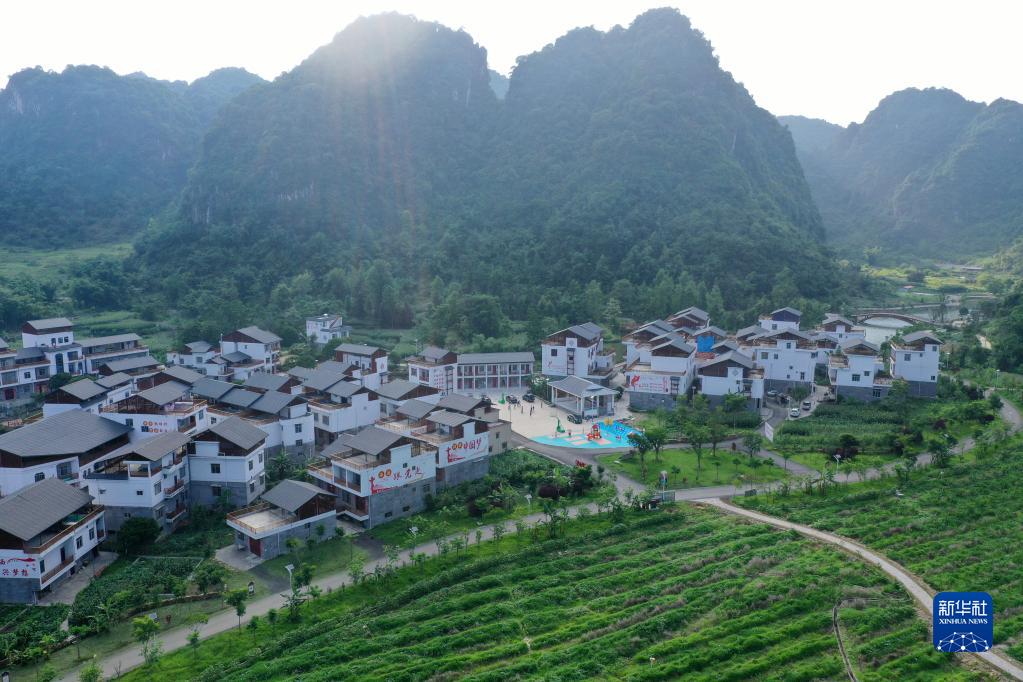这是广西百色市田阳区五村镇巴某村的民居和太阳能路灯(无人机照片,2020年6月4日摄)。