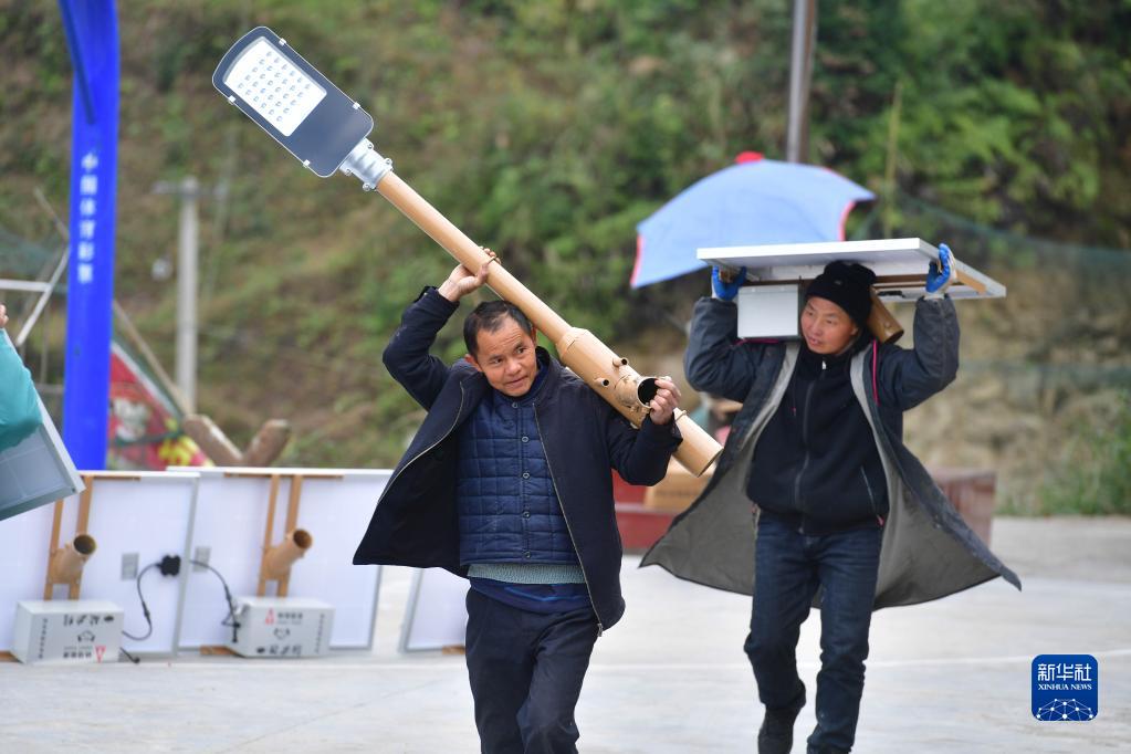 广西融水苗族自治县杆洞乡党鸠村村民准备安装太阳能路灯(2020年12月1日摄)。