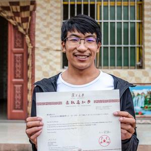 宁蒗宁海民族中学第三届“海安班”学生苏文杰展示不久前收到的复旦大学录取通知书(8月25日摄)。新华社记者 胡超 摄