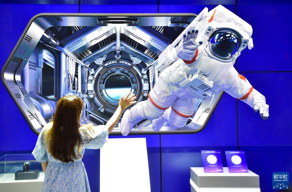 8月22日,媒体记者在2021智博会展馆内参观裸眼3D展示。