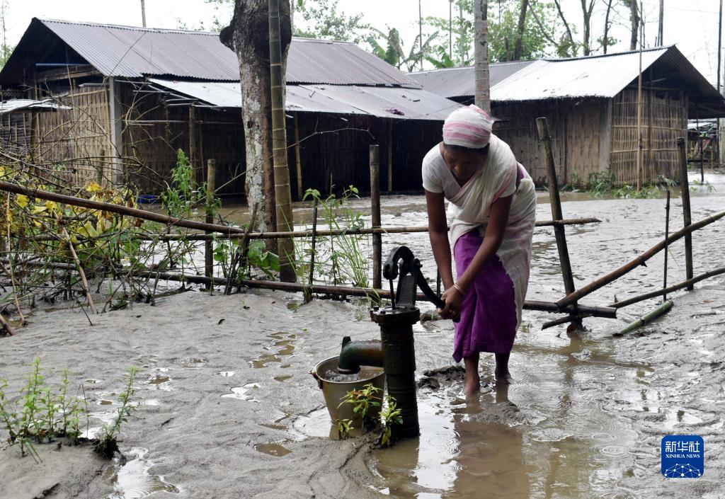8月28日,在印度阿萨姆邦,一名女子在一处几乎被淤泥覆盖的水井旁打水。