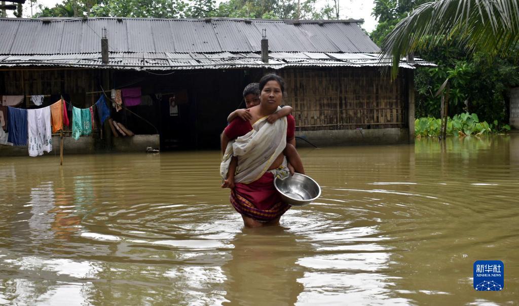 8月28日,一名女子带着孩子在印度阿萨姆邦一村庄的洪水中行走。