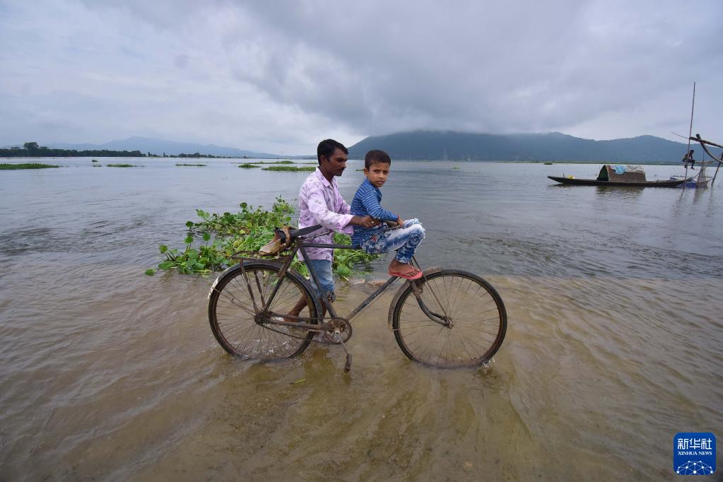 8月28日,在印度阿萨姆邦一个洪水泛滥的村庄,一名男子推着自行车涉水前行。