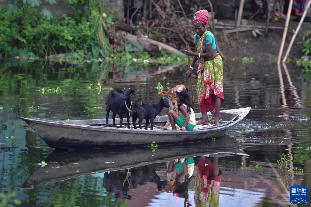 8月28日,一名妇女带着一名女孩在印度阿萨姆邦一处洪水泛滥的区域撑船行进。