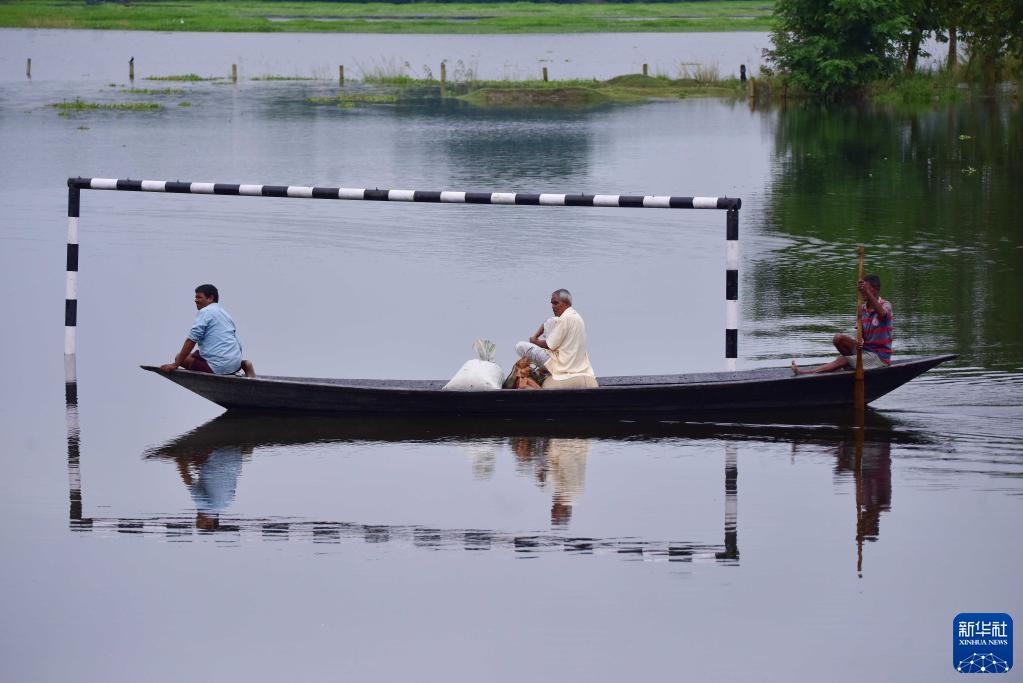 8月28日,当地居民在印度阿萨姆邦一处洪水泛滥的区域乘船前行。