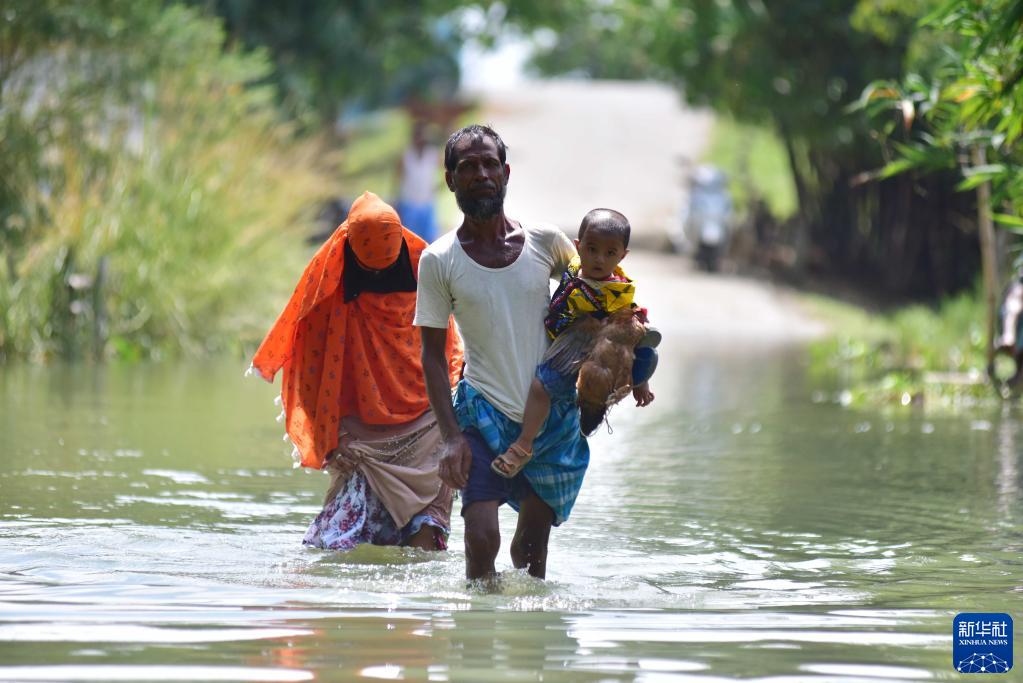 8月28日,在印度阿萨姆邦一个洪水泛滥的村庄,人们涉水前行。