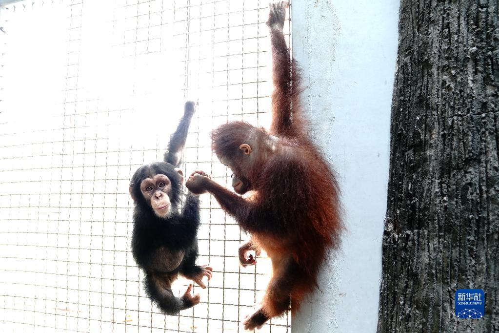 8月28日,“黑妞”和黑猩猩小伙伴交上了朋友。新华社记者 张建松 摄