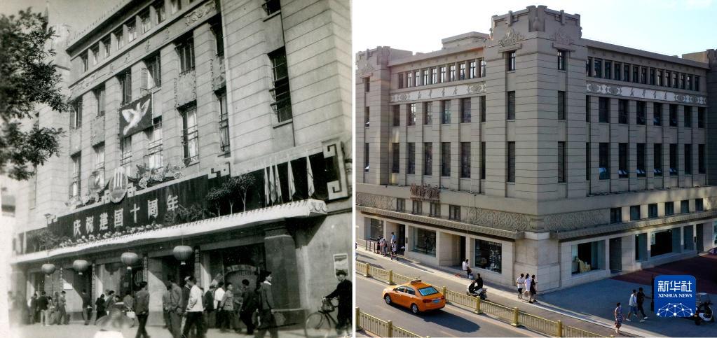这是一张拼版照片,左图为:1959年西安钟楼书店外景(钟楼书店供图);右图为:无人机拍摄的西安钟楼书店外景(8月27日,新华社记者刘潇摄)。