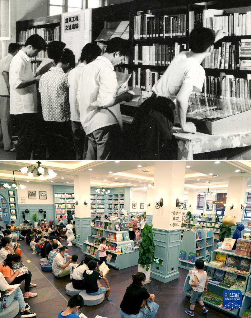 这是一张拼版照片,上图为:20世纪70年代中期西安钟楼书店内的读者(钟楼书店供图);下图为:读者在西安钟楼书店少儿区阅读(8月25日,新华社记者刘潇摄)。