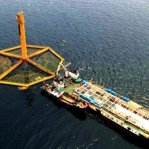 在山东日照市一个海洋牧场,工作人员往养殖网箱投放鱼苗(2020年9月9日摄)。新华社发(房红金 摄)