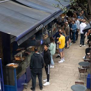 8月30日,人们在英国伦敦伯勒市场的一处食品摊位前选购。