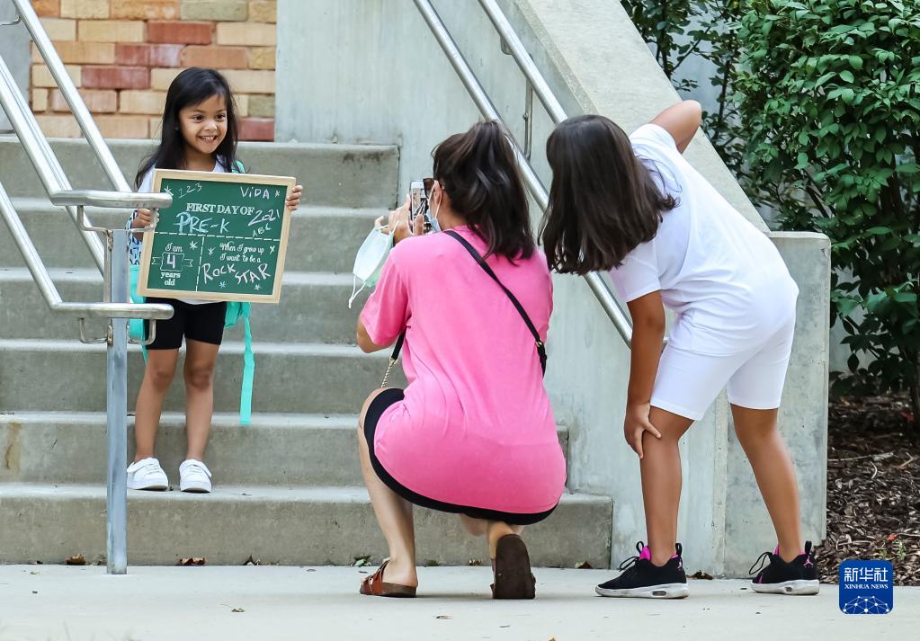 8月30日,在美国芝加哥,家长在开学日给孩子拍照。