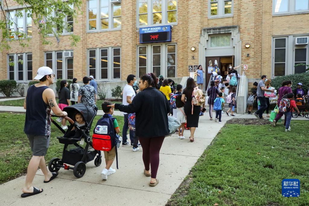 8月30日,在美国芝加哥,家长在开学日送孩子上学。