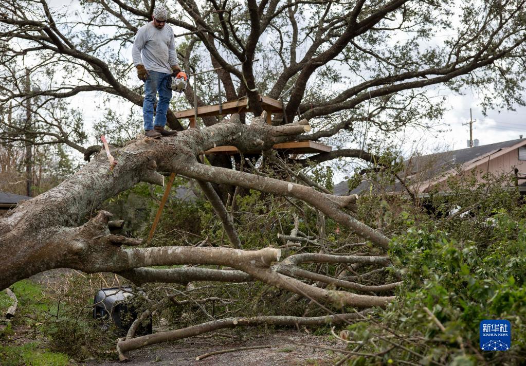 8月30日,在美国路易斯安那州霍马,一名男子站在被飓风吹倒的大树上。
