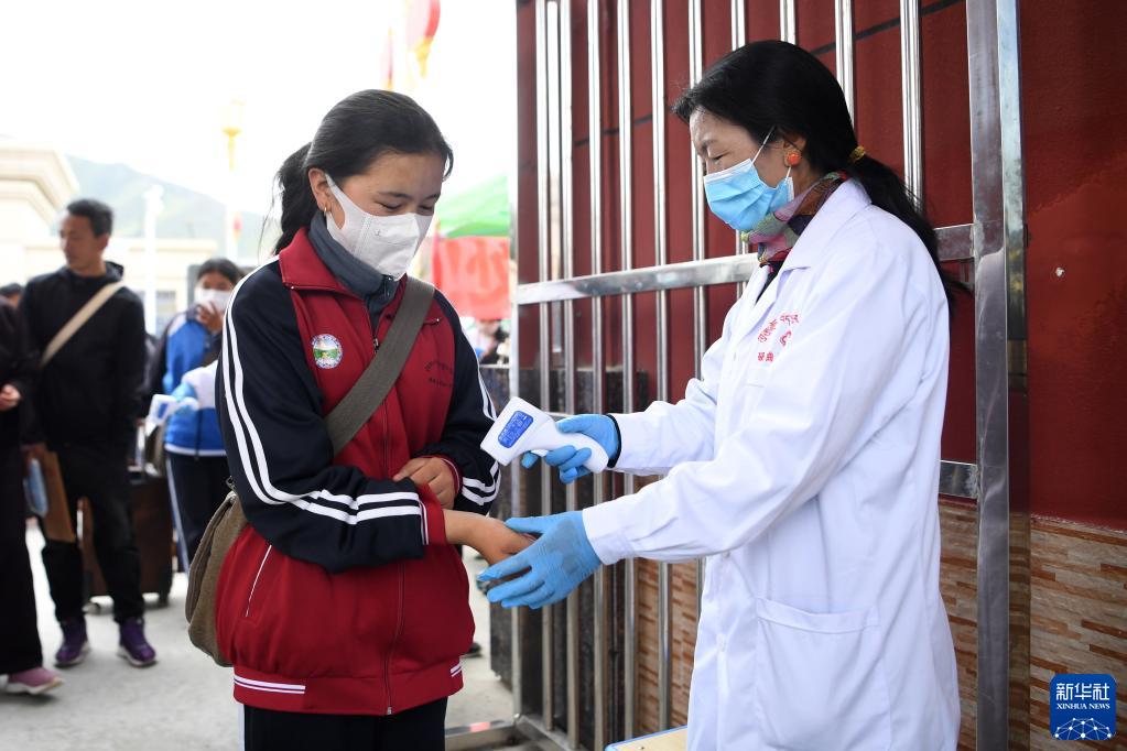 碌曲县藏族中学学生进入校园时测量体温(8月30日摄)。