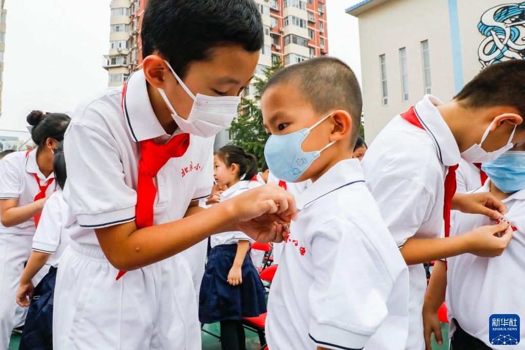 8月31日,北京小学广外校区高年级学生在开学典礼上为刚刚入学的一年级新生戴校徽。