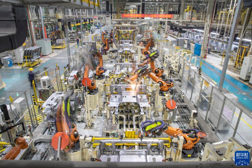 4月2日,在重庆上汽依维柯红岩商用车有限公司焊装车间,机器人在进行焊接作业。新华社记者 黄伟 摄